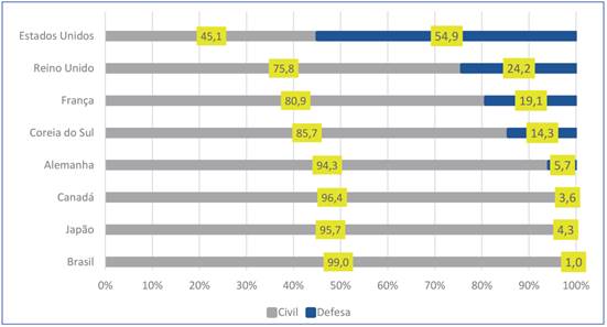 A Figura 2 mostra a média do percentual da dotação orçamentária governamental, entre 2000 e 2013, em P&D dos setores civil e de defesa de países selecionados. Os Estados Unidos lideram o percentual de investimento em defesa, sendo, inclusive, o único país da amostra em que os investimentos na indústria dominam os gastos totais do país. Percebe-se que o Brasil ainda apresenta baixo percentual de investimento na indústria.