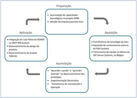 A Figura 20 mostra o ciclo de aprendizagem tecnológica do projeto do Reparo de Metralhadora Automatizado X (REMAX). Na etapa de preparação, o Exército preparou e utilizou as capacidades adquiridas no desenvolvimento do projeto NFBR. Conforme descrito na subseção “Acumulação de níveis de capacidades tecnológicas do Exército Brasileiro na implementação do projeto REMAX”, o projeto da NFBR exigiu um intenso processo de capacitação de profissionais, investimento em infraestrutura e adaptação do sistema organizacional do Exército. O que quer dizer que o EB já havia utilizado mecanismos de aprendizagem e acumulado capacidades no projeto anterior.