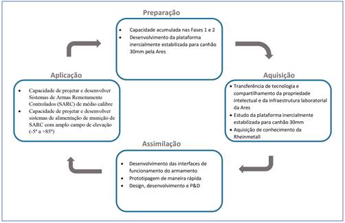 Na etapa de aquisição, o CTEx foi beneficiado com uma transferência de tecnologia da ARES, que compartilhou 50% de sua propriedade intelectual, 100% do pacote técnico, sua infraestrutura laboratorial, adquiriu componentes e equipamentos e disponibilizou a plataforma inercialmente estabilizada para canhão 30 mm para estudo. O CTEx ficou responsável por disponibilizar sua infraestrutura laboratorial e seus recursos humanos, preparar o projeto para a P&D, além de adquirir no exterior o armamento principal e seus acessórios. Além disso, a aproximação da ARES e do CTEx com a Rheinmetall, em visitas da empresa ao Centro, visitas dos profissionais do projeto à fábrica da Rheinmetall, na Alemanha, e a obtenção do pacote de dados técnicos do canhão possibilitaram a aquisição de conhecimento pelos profissionais envolvidos.