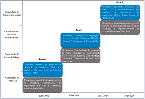 Esta subseção apresenta de maneira descritiva a evolução da acumulação de níveis de capacidades tecnológicas pelo EB durante a implementação dos projetos NFBR, REMAX e TORC30. A seção está dividida em três subseções: Fase 0: Nova Família Blindada sobre Rodas (1999-2006); Fase 1: Reparo de Metralhadora Automatizado X (2006-2011); e Fase 2: Torre Operada Remotamente e Estabilizada para Canhão 30mm (2011-2016).