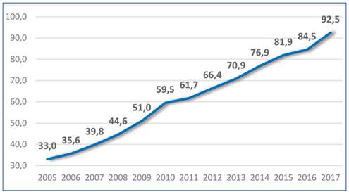 A Figura 3 mostra a evolução orçamentária dos investimentos no Ministério da Defesa do Brasil, entre 2005 e 2017. Nos últimos anos, os recursos direcionados à defesa nacional obtiveram um incremento significativo, saltando de R$ 33 bilhões, em 2005, para R$ 93 bilhões, em 2017, sendo 43% destinados ao Exército Brasileiro (BRASIL, 2016c). Tal aumento pode ser explicado, em parte, pela criação da Estratégia Nacional de Defesa, que permitiu a retomada da indústria de defesa como tema de enfoque de investimentos no Brasil (BRASIL, 2012). No mesmo período, o Índice Nacional de Preços ao Consumidor Amplo (IPCA) alcançou 5,69% em 2005. Sua mais alta variação, no período, ocorreu em 2015, com 10,67%, terminando com 2,95%, em 2017 (BRASIL, 2018a). Em 2016, os investimentos foram divididos em: despesas de pessoal (76%), despesas de custeio (14%), investimentos em projetos (8%) e dívidas (2%), sendo R$ 906 milhões destinados à P&D do EB, para o desenvolvimento de projetos como Sisfron, Astros 2020 e os Blindados Guarani (BRASIL, 2018b). No entanto, o crescimento nominal do orçamento de defesa do País não significou aumento no seu percentual em relação ao PIB brasileiro.