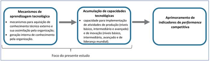 Considera-se aprendizagem tecnológica um processo constituído por vários fluxos de conhecimento externos e internos que permitem organizações e países acumularem suas capacidades tecnológicas (FIGUEIREDO, 2015). Este artigo utiliza a definição de Figueiredo (2015), que identifica três tipos de mecanismo de aprendizagem: (i) intraempresariais (alavancagem de conhecimento externo e geração interna de saber tecnológico); (ii) interempresariais (fluxos de saber entre subsidiárias de empresas multinacionais, localizadas no Brasil e suas empresas-mães e empresas-irmãs); e (iii) interorganizacionais (ligações de saber entre as empresas e as demais organizações do sistema de inovação). A Figura 5 mostra o relacionamento entre a aprendizagem tecnológica, o processo de acumulação de capacidades tecnológicas para inovação e como esse processo influencia diretamente os indicadores de performance competitiva da empresa. Importante salientar que o presente estudo tem como foco analisar apenas o processo de acumulação de capacidades tecnológicas e o papel dos subjacentes processos dos mecanismos de aprendizagem tecnológica, como explicitado na Figura 5.