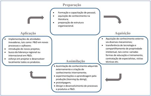 A Figura 6 apresenta o modelo de ciclo de aprendizagem tecnológica subjacente à acumulação de capacidades tecnológicas inovadoras, adotado no estudo. Ele foi desenvolvido segundo os conceitos apresentados por Kim (1998) para a trajetória de aprendizagem tecnológica em projetos realizados em países de economia emergente. O modelo evidencia que tais projetos são constituídos por quatro etapas: preparação, aquisição, assimilação e aplicação.