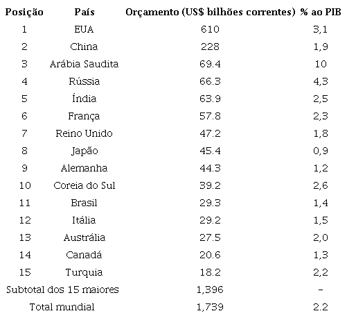 Estima-se que o total das despesas militares mundiais tenha atingido US$ 1,739 bilhão em 2017, o nível mais alto desde o fim da Guerra Fria (TIAN, FLEURANT, KUIMOVA et al., 2018). A Tabela 1 mostra o ranking dos 15 países com os maiores orçamentos de defesa do mundo em 2017. Os Estados Unidos dominam os gastos militares mundiais com US$ 610 bilhões. O orçamento brasileiro ocupa o 11° lugar no ranking, no período.