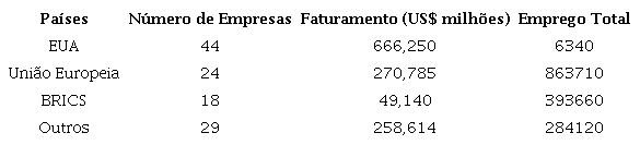 A Tabela 2 mostra as maiores empresas de defesa do mundo, distribuídas por país/região em 2016. A indústria de defesa está concentrada em poucos países, refletindo tanto a concentração da demanda como o elevado diferencial de capacitação produtiva, tecnológica e empresarial das diferentes nações (BRASIL, 2016c). Percebe-se a decisiva influência dos EUA, dotando 44 empresas, e da União Europeia, com 24 empresas. Contudo, como já foi dito, as economias emergentes estão buscando reduzir sua dependência de outras nações, o que é refletido no avanço dos países que compõem o BRICS, somando 19 empresas. Das dezoito, treze são da Rússia, cinco são da Índia e apenas uma é do Brasil.