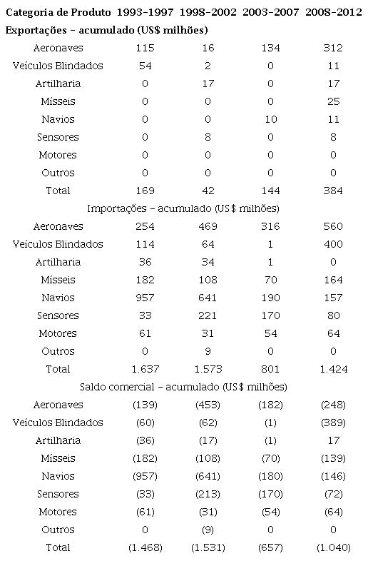 A Tabela 3 apresenta a evolução do comércio exterior de equipamentos militares do Brasil por categoria de produto (em US$ milhões) entre 1993 e 2012. O País possui um baixo volume de exportações e ocupa uma posição bastante tímida no mercado internacional, ocupando o 25° lugar no ranking de países com maior volume exportado na indústria (CORREA FILHO, BARROS, CASTRO et al., 2013). Contudo se constata que a diversidade de exportações é baixa. Isso pode ser explicado pelo fato de as empresas Embraer e Forjas Taurus deterem os títulos de maiores exportadoras nacionais atuais com aeronaves e armamentos leves (CUNHA e NOGUEIRA, 2017).