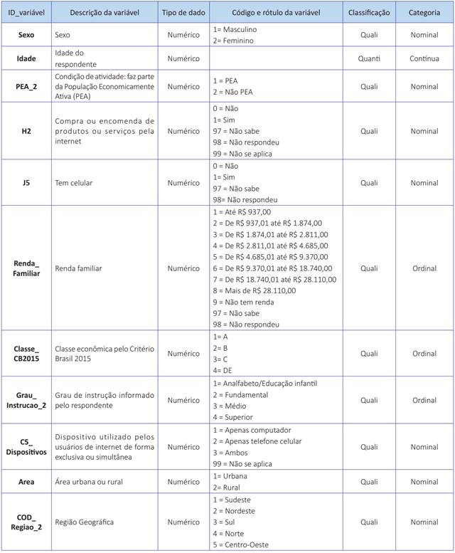 A base de dados da TIC Domicílios 2019 (indivíduos) contém 20.536 respostas de questionários com 249 questões, o que representa 20.536 observações e 249 variáveis. Para os objetivos deste estudo, as variáveis relevantes são aquelas relacionadas com a caraterização socioeconômica do indivíduo, presentes nos seguintes grupos do dicionário de variáveis da pesquisa TIC Domicílios 2019: informações do domicílio, uso da internet, comércio eletrônico, governo eletrônico, cobertura e variáveis agregadas - esta apresenta informações agregadas de variáveis constantes nos demais.