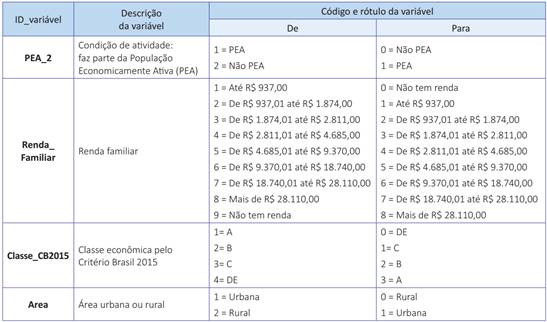 Considerando o grupo informações do domicílio, foram escolhidas as variáveis “sexo”, “idade” e “renda familiar”. As variáveis “PEA” (condição de atividade) e “grau de instrução” foram substituídas por “PEA 2” e “grau de instrução 2”, do grupo cobertura, que são versões com rótulos ajustados das anteriores.
