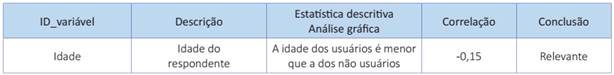 Para a variável quantitativa Idade, foram calculadas as estatísticas descritivas, apresentadas na Tabela 2, e elaborada a análise de correlação, apresentado no Quadro 6. Os resultados dos testes indicam que há relação de dependência entre a variável que representa uso de governo eletrônico e a variável Idade.