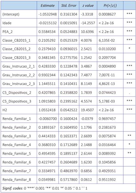 Para o cálculo da regressão logística, foi necessário transformar as variáveis Renda_Familiar, Classe_CB2015, Grau_Instrucao_2 e C5_Dispositivos em variáveis dummy. Para isso, foi criado um novo dataframe no R, utilizando a função dummy_cols(), do pacote fastDummies (Kaplan, 2020). O cálculo da regressão logística foi realizado sobre o dataframe que continha as variáveis dummy, utilizando a função multinom(), do pacote nnet (Venables & Ripley, 2002). A estimativa das respostas do modelo para a variável dependente foi realizada com auxílio da função predict(), do pacote caret (Kuhn, 2020).