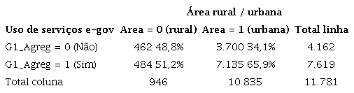 Com base nesses resultados, essas variáveis foram descartadas para a análise de regressão. Havia uma dúvida quanto à variável que representa área urbana ou rural, pois, apesar de os resultados dos testes sugerirem que a associação entre esta e a variável uso de governo eletrônico seja fraca, a tabela de associação entre tal variável e a variável dependente G1_Agreg apresenta uma inversão na proporção entre usuários e não usuários de governo eletrônico quando há mudança de área rural para urbana, conforme apresentado na Tabela 1. Entretanto, apesar disso, decidiu-se por excluir essa variável da análise de regressão.