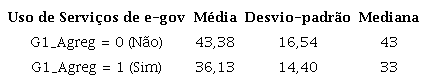 O Módulo G, que aborda a temática de governo eletrônico, apresenta 29 questões relacionadas ao perfil de uso de serviços de governo eletrônico. As respostas a essas questões foram agregadas numa única variável, denominada G1_Agreg, que indica se o usuário usou ou não serviços de governo eletrônico.