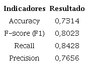 A análise indicou que o modelo apresenta uma resposta ajustada, com nível aceitável de acurácia, conforme pode ser observado pelo resultado dos indicadores Accuracy e F-score, apresentados na Tabela 4.