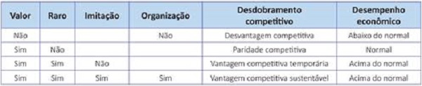 Ao responder a tais questionamentos com “sim” ou “não”, é possível analisar as implicações competitivas e o desempenho econômico da empresa (Barney & Hesterly, 2007), conforme Quadro 1.
