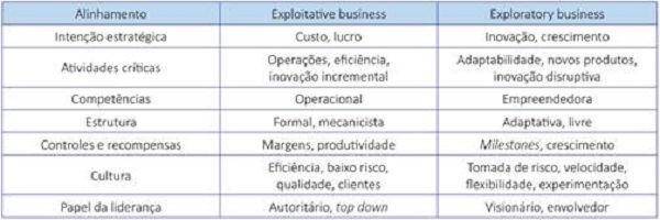 A habilidade da empesa de executar seu modelo de negócio atual (foco no lucro) é denominada exploitation, enquanto a de inovar ou explorar novos modelos de negócios (foco no crescimento) é chamada de exploration. O foco na primeira requer estratégia, estrutura, processo e cultura que diferem daqueles requeridos em exploration. As principais diferenças entre exploitation e exploration são apresentadas no Quadro 3.