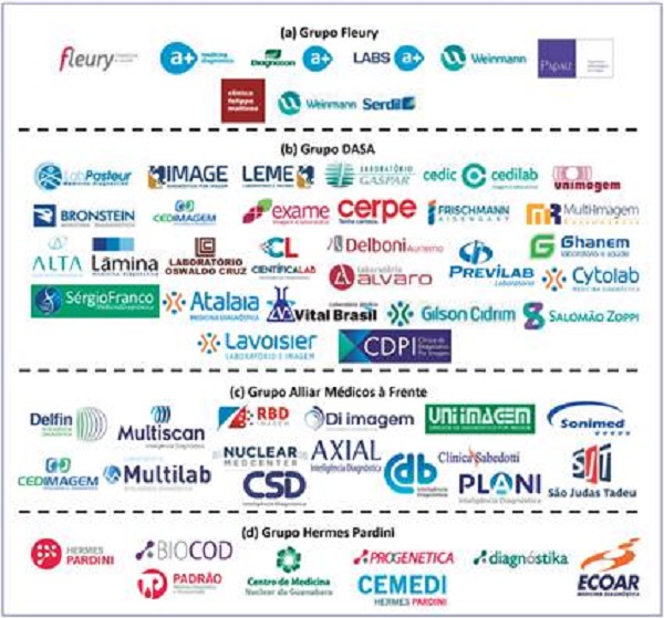 Em 2018, o mercado privado de medicina diagnóstica no Brasil era composto por cerca de 16 mil laboratórios, gerando uma receita próxima de R$ 30 bilhões. Desse mercado, 25% de market share era obtido pelos seguintes grupos: Diagnósticos da América S. A. (Dasa), Grupo Fleury, Centro de Imagens Diagnósticos S. A. (Alliar Médicos à Frente) e Hermes Pardini. Os laboratórios (ou marcas) que compõem cada um dos quatro principais grupos são apresentados na Figura 1.
