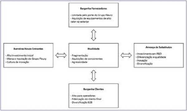 Além disso, é possível fazer uma análise competitiva do Grupo Fleury com base no modelo das cinco forças de Porter: rivalidade entre os concorrentes (nível de competição), poder de barganha dos fornecedores (nível de dependência destes), poder de barganha dos clientes (nível de dependência destes, que aumenta com a competitividade do mercado), ameaças/barreiras à entrada de novos concorrentes (nível de dificuldade para a entrada de novos concorrentes no mercado) e ameaça de produtos ou serviços substitutos (existência de produtos ou serviços com funções equivalentes) (Porter, 1979, 2008).