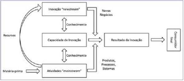 O principal desafio para o sucesso de uma organização ambidestra é criar e manter um fluxo intenso de informação e conexão entre o mercado principal (mainstream) e o novo mercado (newstream). De acordo com Kanter (1989), as organizações são mais efetivas quando os diferentes recursos necessários no mainstream e no newstream são reconhecidos e a gestão é feita de forma autônoma. Ao administrar as unidades de negócios dessa maneira, é possível balancear as tensões de estabilidade e de mudança, conforme a Figura 5, pois as atividades no mainstream geram recursos para o desenvolvimento dos mercados no newstream, que, por sua vez, são assimilados de volta no mainstream. Esse ciclo é melhorado continuamente, com a constante comunicação entre os dois segmentos.