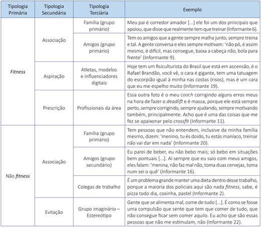 De fato, os entrevistados expuseram a necessidade de inspirar outras pessoas, aproximando-se do papel social desempenhado por seus grupos de aspiração. Essa permeabilidade indica que é possível delimitar os agrupamentos identificados na pesquisa por meio de outras características que ultrapassam, por exemplo, os atributos de laços de sangue e amizade, indicando que a ênfase em dada qualidade grupal determinará sua denominação de referência. Na pesquisa, mostrou-se plausível considerar os agrupamentos de acordo com o estilo de vida adotado ou almejado, reconhecendo-os como fitness e não fitness. O primeiro é formado por grupos de associação e aspiração que praticam ou admiram esse modo de vivência; o segundo constitui-se de grupos de associação e evitação que são distanciados das premissas, exigências e práticas fitness.