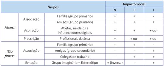 Assim, dissertamos que, em geral, os agrupamentos fitness têm seu impacto social aumentado graças à força e ao imediatismo que possuem e que os grupos não fitness amplificam tal influência mediante elevado número de membros.