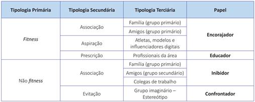 Apesar da identificação dos tipos de grupo, reconhecemos que os agrupamentos citados possuem permeabilidade (Reid et al., 2004), ou seja, consentem a transição do indivíduo entre um grupo e outro, tornando-os dinâmicos. Por exemplo, familiares (membros do grupo de pertencimento) que não compartilham de práticas fitness podem ser englobados em grupos de dissociação. Ademais, o indivíduo que admira certo influenciador digital pode se aproximar do papel social desempenhado por este (Djafarova & Rushworth, 2017; Fombelle et al., 2012), buscando alcançar mobilidade individual e, com isso, levar o agrupamento a se tornar de afiliação (Hogg et al., 1995; Trepte & Loy, 2017), de acordo com o que detalha o Informante 4.
