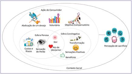 Destacam-se ainda estudos que consideram o sacrifício como um comportamento de transformação que traz um sentimento de perda pessoal, visando a um benefício (Matear, 2014), e que pode ser percebido como uma expressão de amor e como um presente perfeito para outra pessoa (Belk & Coon, 1993). Refletindo sobre a multiplicidade dos conceitos na área de Marketing, Silva e Farias (2020) sugerem características centrais que qualifiquem uma ação como um sacrifício percebido pelo consumidor, englobando também aspectos específicos do sacrifício ao observar o estilo de vida fitness (Figura 1). Segundo tais autores (Silva & Farias, 2020), o sacrifício percebido é descrito como uma ação e/ou estado de abdicação de desejos, com vistas ao alcance de um objetivo recompensador, envolvendo uma decisão voluntária de o fazer, mediante ponderação das esferas penosa e conchegativa. A esfera penosa é composta pelos custos, riscos e pela sensação de perda, ou seja, constitui os elementos negativos, os prejuízos percebidos com a ação abdicadora. Já a esfera conchegativa engloba os ganhos gerados com a ação abdicadora, retratando o alcance do objetivo recompensador, trazendo sensações positivas, benefícios e transformações que justificam a prática do sacrifício.