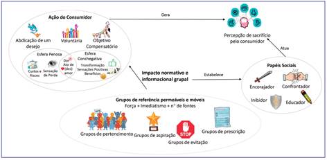 Sumariamente, consideramos que os grupos de referência (afiliação, aspiração, evitação e prescrição), que possuem características de permeabilidade e mobilidade em termos de impacto, influenciam normativa e informativamente as esferas penosa e conchegativa de uma ação abdicadora movida por um objetivo compensatório que estabelece a percepção de sacrifício. Aliás, esses mesmos agrupamentos exercem determinados papéis sociais que contribuem para que a ação sacrificante ocorra, permaneça ou não seja praticada, encorajando ou inibindo-a, educando ou confrontando o sujeito sobre suas escolhas e comportamentos de consumo, moldando sua identidade social.