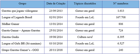Para compreendermos como as mulheres enfrentam a opressão de gênero no consumo, realizamos uma pesquisa qualitativa utilizando netnografia e entrevistas em profundidade como formas de obtenção de dados. Para iniciarmos a imersão no contexto de pesquisa, a primeira autora realizou a netnografia durante 13 meses, seguindo as recomendações de Kozinets (2019), observando, interagindo e participando cotidianamente, em especial, de grupos ligados a jogos no Facebook (ver Quadro 1) que foram escolhidos por sua relevância no mundo gamer. Como características, os grupos estudados existem há pelo menos 3 anos, têm mais de 200 participantes, publicam novos tópicos de discursão semanalmente e apresentam casos de assédio ou hostilização contra mulheres em algum momento nas conversas.