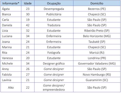 Além da netnografia, a primeira autora conduziu virtualmente, em razão da pandemia de covid-19, 15 entrevistas em profundidade (Thompson, Pollio, & Locander, 1994). As primeiras informantes (Quadro 2) foram recrutadas num tópico de discussão numa das comunidades acompanhadas durante a netnografia. A autora se identificou como pesquisadora nos grupos on-line e, após um período de observação, entrou em contato com as possíveis informantes. Depois das primeiras entrevistas, foi utilizada a estratégia de amostragem de bola de neve (Miles & Huberman, 1994), quando o informante indica possíveis novos participantes da pesquisa, ampliando o leque. O critério de seleção dos informantes foi a autoderminação como mulher e gamer, o que implica o envolvimento próximo ao diário com os jogos. As entrevistas objetivaram ampliar o entendimento das formas de atuação feminina na comunidade e suas interações como os demais atores do ecossistema. Em razão disso, foram identificados tópicos como a socialização nessa prática de consumo, situações problemáticas vivenciadas e (re)ações, além de relacionamento com jogadores e atores institucionais.