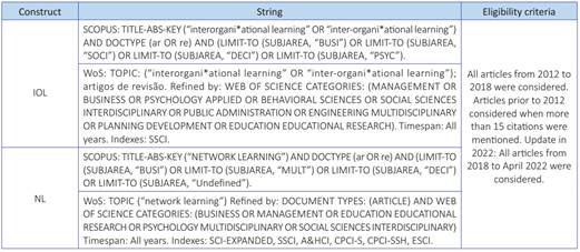 The integrative review was conducted in three stages. The first and second stages consisted of two-structured literature searches, one for IOL and the other for NL. Scopus and Web of Science were the selected databases. At the third stage, specific publications on the 4i Framework lens (Crossan et al., 1999) were sought to extend it to the network level, as described later. Box 1 presents the search strategies and eligibility criteria for the first and second stages.