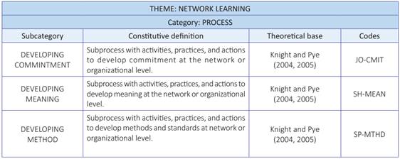 “Process” relates to the question “how to learn?” (Wegner & Mozzato, 2019). It contains three sub-processes that promote NL (Knight & Pye, 2005): developing shared meaning among the organizations (SH-MEAN), developing joint commitment (JO-CMIT), and developing specific methods (SP-MTHD) at the network level, at the organizational level, or both of them. SH-MEAN is about collective sense-making enabling joint learning processes (Morland et al., 2019). JO-CMIT reflects closer, value-adding, engaging, nurturing, and productive exchanges (Carmeli, Zivan, Gomes, & Markman, 2021). SP-MTHD emerges from the collective knowledge creation and shapes the learning outcomes through changes in network practices and routines (Dietrichson & Bukh, 2020; Knight, 2002; Knight & Pye, 2004, 2005). These NL sub-processes (Knight & Pye, 2005) enable a network to mimic a single learning entity.