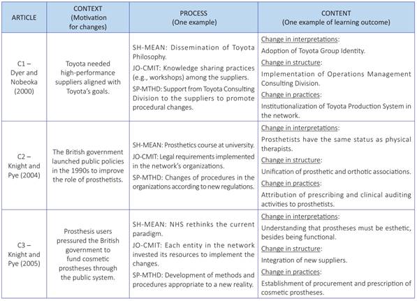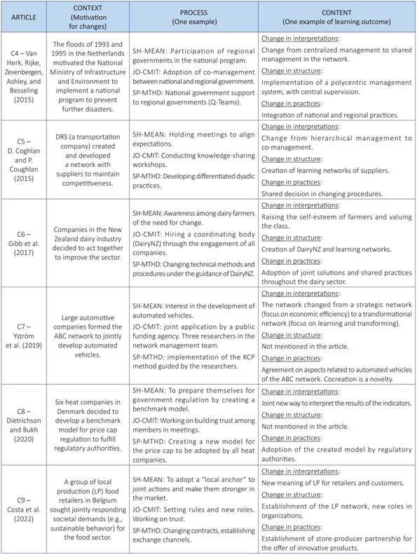 The nine empirical cases (C1, C2, C3, ..., C9) described in the selected articles add evidence concerning the factors of the NL Model (Context, Content, and Process). As can be seen in Box 3, the context surrounding the networks promoted their change, and not only for some of their organizations. From the analyzed cases, a pattern was identified: goals were intentionally set at the network level. The three NL sub-processes (Knight & Pye, 2005) were identified in the cases as the main promoters for the engagement of the group of organizations’ joint learning aiming the network goals, as described as follows: