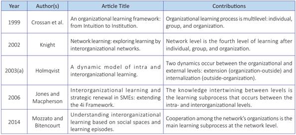 Studies in the OL field encompass learning processes moving across the individual, group, and organizational levels (Crossan et al., 1999; Mokhtarzadeh, Mahdiraji, Jafarpanah, Jafari-Sadeghi, & Cardinali, 2020; Scipioni, Russ, & Niccolini, 2021). The network is the fourth level (Crossan et al., 1999; Knight, 2002; Leung et al., 2019; Mozzato & Bitencourt, 2014). From five studies dealing with the multilevel learning process, Box 4 presents the studies that described the multilevel learning process.
