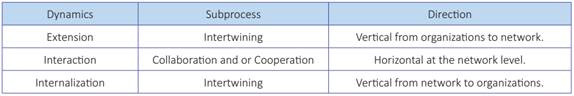 The dynamics termed ‘interaction’ refers to the organizations’ mutual knowledge exchange and learning process in collaboration (active engagement) or cooperation (agreement) (Kozar, 2010; Mozzato & Bitencourt, 2014). Interaction dynamics depicts the horizontal shape, as it occurs at one level: the network. Interaction operates in “structured or non-structured social spaces” (Mozzato & Bitencourt, 2014, p. 286), where IOL’s core subprocesses of cooperation and collaboration occur due to a collective consciousness (Cunha et al., 2012).