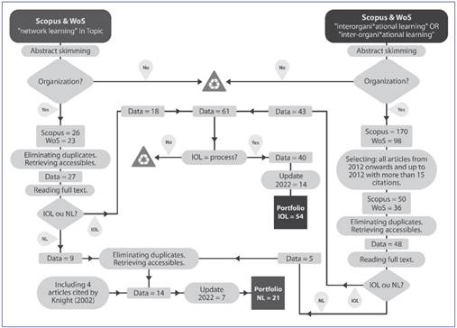 The process depicted in Figure 1 was carried out in 2018 and updated in April 2022. For NL, the broad descriptor “network learning” in the topic was chosen due to the scarcity of articles about the subject in organizational studies (inclusion criterion). For IOL, the abstracts revealed that more than 100 articles were eligible for possible analysis in full. To cover the most meaningful ones for this study, another criterion was set: all articles from 2012 to 2018 were considered, and up to 2012 only articles with more than 15 citations were included. Figure 1 summarizes the search flow of the integrative review.