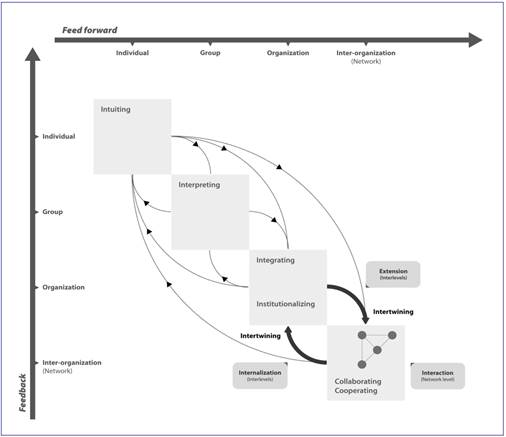 The multilevel IOL process presented in Figure 2 is based on the contributions of the authors cited in Box 4. It indicates a continuous flow of feed-forward and feedback experienced by different learning entities: individuals, groups, and organizations. As presented in Figure 2, the network locates at a level above the organization. This didactic resource shows that IOL is a process with a set of subprocesses - here termed as ‘dynamics’ (Holmqvist, 2003a) - performed by the organization (learning entity) at the organizational and the network level, and between them. Thus, IOL is a process with three dynamics: two vertical ones that occur between the organization and network levels (extension and internalization), and one horizontal (interaction) that occurs at the network level (Jones & Macpherson, 2006; Mozzato & Bitencourt, 2014) (Box 5).