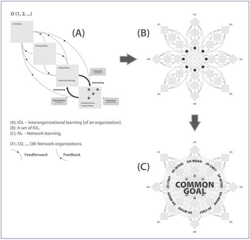 Once the difference between IOL (Figure 3B) and NL (Figure 3C) lies in building or not the connecting ring (Figure 3C), it is possible to figure out how to manage the learning process of organizations in a network, according to the objectives, whether organization’s (IOL) or network’s (NL). For IOL, the subprocesses SH-MEAN and JO-CMIT occur in interaction dynamics at the network level, but not necessarily at the organizational level. Thus, SP-MTHD, in IOL, occurs only at the organizational level. SP-MTHD reflects changes in organizational practices and routines for the sake of the organization’s goals and not the network’s.
