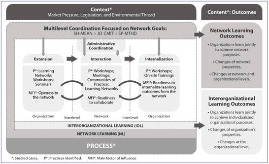For NL, the nature of the coordination activities is multilevel, as the learning process of a group of organizations as a single entity requires the connecting subprocesses SH-MEAN, JO-CMIT, and SP-MTHD that permeate organizational and network levels. Therefore, multilevel coordination performs much more tasks than administrative coordination in IOL and might even “enter” the organizational level. For instance, when one organization has a problem with internalization dynamics, the multilevel coordination may intermediate help from another organization sending its experts (D. Coghlan & P. Coughlan, 2015; Dyer & Nobeoka, 2000; Gibb et al., 2017; Van Herk et al., 2015). If the problem is the low absorptive capacity (Cohen & Levinthal, 1990) of one organization, support may also come from the network.