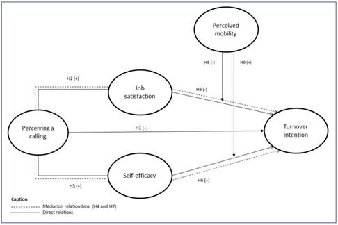 In view of these mixed results, this relationship between calling and turnover intention is not so obvious. In this context, Esteves and Lopes (2017) propose that further studies be carried out to explore these possible relationships between calling and turnover intention. In order to fill this literature gap, this research aims to analyse the existence of positive, negative, direct and indirect associations (via job satisfaction and self-efficacy) between perceiving a calling and turnover intention, as well as the moderating role of the perceived mobility in such relationships.