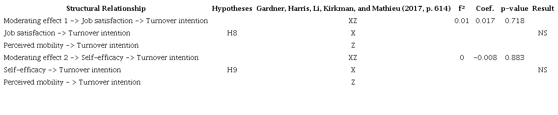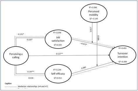 After validating the measurement model, we evaluated the fit or the Coefficients of determination (R²) responsible for indicating the explanatory capacity of the model (Fávero & Belfiore, 2021). According to Bido and D. Silva (2019), values of R² of 0.02, 0.13 and 0.26 can be described, respectively, as weak, moderate, and substantial. In the structural model (see Figure 2), the endogenous constructs presented the following values: a) job satisfaction (R²=0.056, weak), b) self-efficacy (R²=0.249, moderate), c) turnover intention (R²=0.453, substantial), d) perceived mobility (R²=0.145, weak).