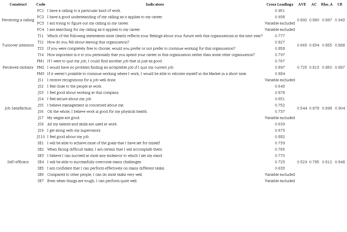 For data collection, we developed a structured questionnaire that was created in Google Forms. The questionnaire was composed of three parts. In the first part, we inserted a text introducing the research and the following question for population control purposes: “What is the nature of the bond of your current occupation?” With this question we aimed to exclude eventual respondents who did not fit the profile of the target population. Therefore, those who answered the option unemployed, self-employed and/or entrepreneur to this question were excluded from the database. In the second part, we present the five constructs already validated that make up the proposed model, being: (i) Perceived calling (Dik, Eldridge, Steger, & Duffy, 2012) composed of four items, with a Likert scale, with an intensity of 1 (totally false for me) to 5 (totally true); (ii) Job satisfaction (Macdonald & Maclntyre, 1997) composed of ten items; (iii) Perceived mobility (Tepper, 2000) composed of 3 items; (iv) Self-efficacy (Chen, Gully, & Eden, 2001) with seven items; (v) Turnover intention (Shore & Martin, 1989) composed of four items, with a Likert scale of 1 (I will definitely stay in the organization) to 5 (I will definitely leave the organization). Constructs ii and iii were measured with a 5-point Likert scale (1: I totally disagree; 5: I totally agree). The third and last part of the questionnaireincluded questions about the profile of respondents, such as: age, gender, education, income, length of employment, region in which one works, nature of employment relationship (public or private) and sector of activity for the purposes of socio-demographic control. All five scales used in this research were translated from English to Portuguese by a professional translator.