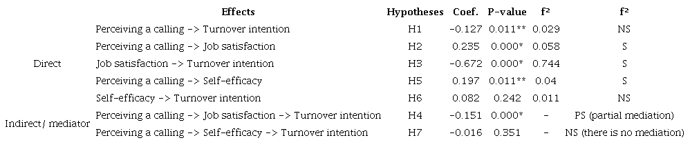 Hypotheses H6 and H7 evaluated, respectively, the direct relationship between self-efficacy and turnover intention and the indirect relationship between perceiving a calling and turnover intention via self-efficacy. Both hypotheses (H6 and H7) were based on the assumption that individuals with greater self-efficacy would have greater courage and confidence to make proactive career decisions, facing a better job opportunity (Gupta et al., 2018) thus, they would present higher levels of turnover intention. This assumption, at least in light of the data from this research, was not corroborated. Thus, the direct and positive relationship hypothesized between self-efficacy and turnover intention (H6) was not supported. This means that, for the individuals in the sample, the perception of being self-effective, does not increase or decrease turnover intention. The relationship between self-efficacy and the intention to leave the employee has been analysed by previous research that showed mixed results, sometimes confirmed a positive relationship (Mone, 1994), sometimes a negative relationship (De Neve & Devos, 2016), sometimes they did not identify a significant effect between the constructs (O’Neill & Mone, 1998). The hypothesized mediation relationship between perceiving a calling and turnover intention via self-efficacy (H7) was not supported. This means that for the employees in the sample, having the perception of being self-effective does not increase or decrease the effect of perceiving a calling on turnover intention. This may be due to the fact that one does not intend to leave their job.