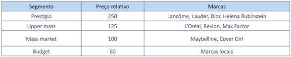 De maneira geral, o mercado mundial de maquiagem é dividido em 3 grandes segmentos: seletivo ou de prestígio, de massa ou de varejo e de vendas diretas. O primeiro é dominado por marcas sofisticadas, de caráter exclusivo, voltadas a um público de alto poder aquisitivo. São exemplos bem-sucedidos nesse segmento a Shiseido e a Lancôme. O segmento é caracterizado basicamente por sua distribuição horizontalizada e por seus preços mais acessíveis a um maior público. É subdivido em 3 grandes faixas: o upper mass, o mass market propriamente dito e o budget. O diferencial de posicionamento em cada faixa é o preço final ao consumidor (ver Quadro 1 abaixo). Dentro da estratégia de portfólios da L’Oréal, marcas como Lancôme ocupariam o segmento prestígio, a L’Oréal Maquiagem ocuparia o segmento upper mass e a Maybelline seria posicionada no segmento mass market. No caso do mercado brasileiro, assim que Maybelline estivesse consolidada, seria dado o sinal verde para o lançamento de L’Oréal Maquiagem.