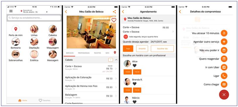 No aplicativo Trinks.com (ver Anexo - Figura 1), o consumidor pode procurar pelo serviço ou estabelecimento desejado, escolher um profissional e solicitar o agendamento de um horário. O compromisso pode ser salvo na agenda do consumidor, que recebe lembretes e notificações pelo aplicativo e por e-mail. O consumidor pode ainda usar o aplicativo para, por exemplo, informar que vai se atrasar 10 minutos, reagendar e cancelar o compromisso, chamar um Uber, consultar a localização do salão no mapa e ligar para o estabelecimento. Salões e profissionais podem também ser favoritados, avaliados com uma a cinco estrelas e receber comentários registrados pelos consumidores após a prestação do serviço, mas poucos o fazem. Os agendamentos também podem ser realizados por computador, e o consumidor não paga para usar os serviços da Trinks.com. As solicitações de agendamento são gerenciadas pelo estabelecimento por meio de uma aplicação da Trinks.com na nuvem (ver Anexo - Figura 2), que funciona ainda como um sistema de gestão para controlar estoques, produtos, comissões, comandas e as finanças do salão.