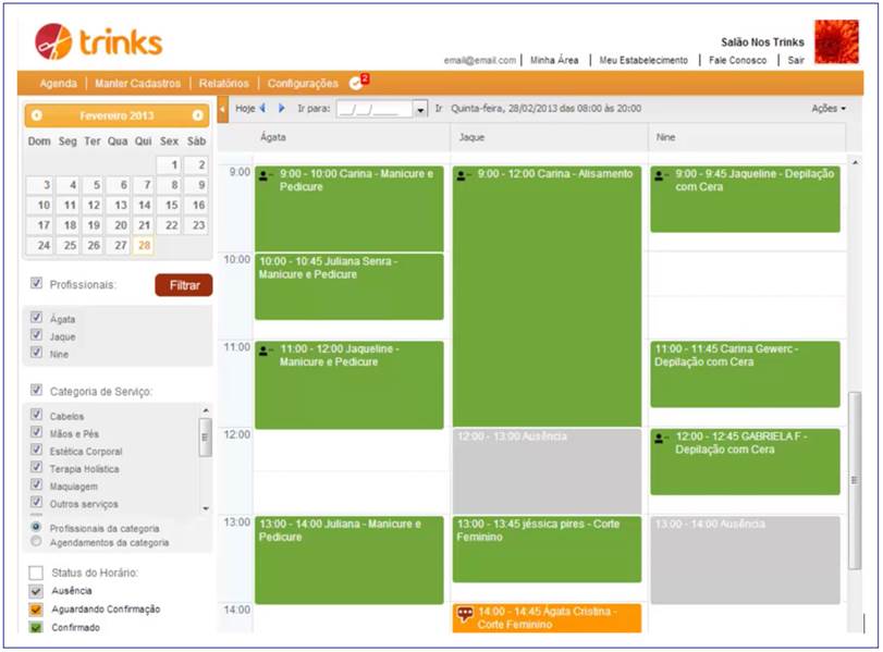 Plataformas de agendamento: Trinks.com (www.trinks.com), SuperAgendador7 (www.superagendador.com) e SalãoVIP (www.salaovip.com.br) estão entre os concorrentes que fornecem sistemas para facilitar a gestão dos salões e o agendamento online dos serviços de beleza.