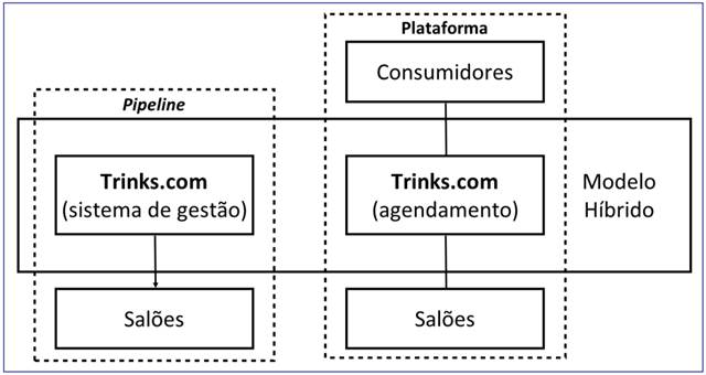 É possível dizer que a Trinks.com opera um negócio híbrido, uma vez que oferece um sistema de gestão aos salões, gerando valor como os pipelines, e uma funcionalidade de agendamento, gerando valor como as plataformas. No contexto do caso, os salões parecem enxergar o agendamento mais como um processo que facilita a gestão do estabelecimento do que como fonte de novos consumidores, isso talvez explique por que uma parte dos salões não utiliza a referida funcionalidade.