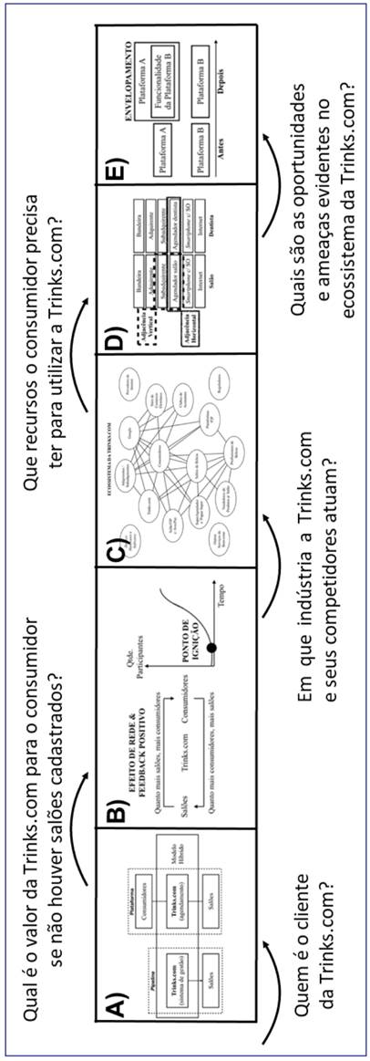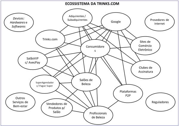 Iansiti e Levien (2004) apontam que o sucesso empresarial depende cada vez mais do monitoramento não apenas do ramo da empresa, mas do ecossistema no qual a empresa está inserida. Desenhar com precisão todo o ecossistema é uma tarefa impossível, por isso Iansiti e Levien (2004) recomendam a identificação dos atores com os quais o futuro da empresa está mais interligado e a determinação das dependências mais críticas para o negócio. Alguns dos principais atores do ecossistema da Trinks.com são: consumidores, profissionais de beleza, salões de beleza, plataformas de agendamento, adquirentes, outros serviços de beleza e bem-estar, buscadores, reguladores, provedores de internet.