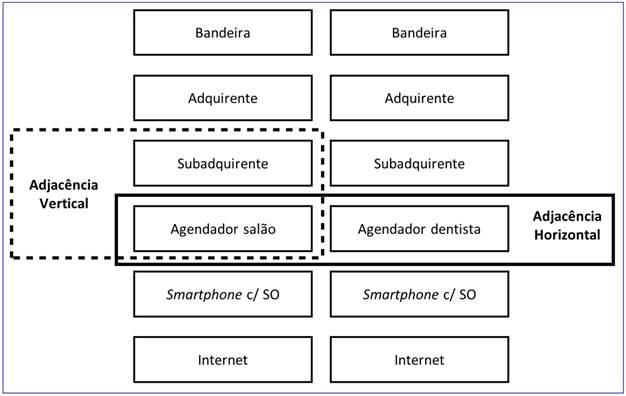 Plataformas digitais podem ser construídas sobre outras plataformas digitais (Evans & Schmalensee, 2016). Quando duas plataformas ocupam elos diferentes, mas próximos, em uma cadeia de valor, diz-se que há uma adjacência vertical ou adjacência da cadeia de valor entre elas (Tiwana, 2014). Por exemplo, no processo de contratação de um serviço de beleza, é possível observar uma adjacência vertical entre plataformas de agendamento e subadquirentes. Da mesma forma, é possível perceber uma adjacência vertical entre plataformas de agendamento e os sistemas operacionais que rodam os aplicativos destas plataformas. Neste exemplo, existe uma interdependência entre plataforma de agendamento e sistema operacional. Sem o aplicativo ou sem o sistema operacional, o agendamento online não ocorre.