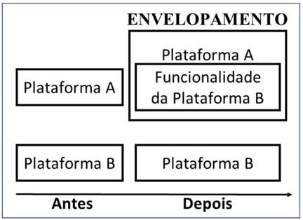 Uma plataforma pode incorporar funcionalidades de outra plataforma, fenômeno conhecido como envelopamento (Eisenmann et al., 2011, 2006). Ao envelopar novas funcionalidades, a plataforma envelopadora tenta aumentar a competitividade de seu bundle. Tiwana (2014) ressalta que ataques de envelopamento possuem três requisitos: (1) haver potencial economia de escala entre os mercados da envelopadora e da envelopada, (2) o ativo alavancado pela envelopadora deve ser relevante e prontamente transferível para o mercado da envelopada, (3) a funcionalidade envelopada deve ser adjacente ao domínio da envelopadora. Chama-se envelopamento horizontal aquele que ocorre com base na adjacência horizontal (ou do cliente) e envelopamento vertical aquele que ocorre com base na adjacência vertical (ou da cadeia de valor).