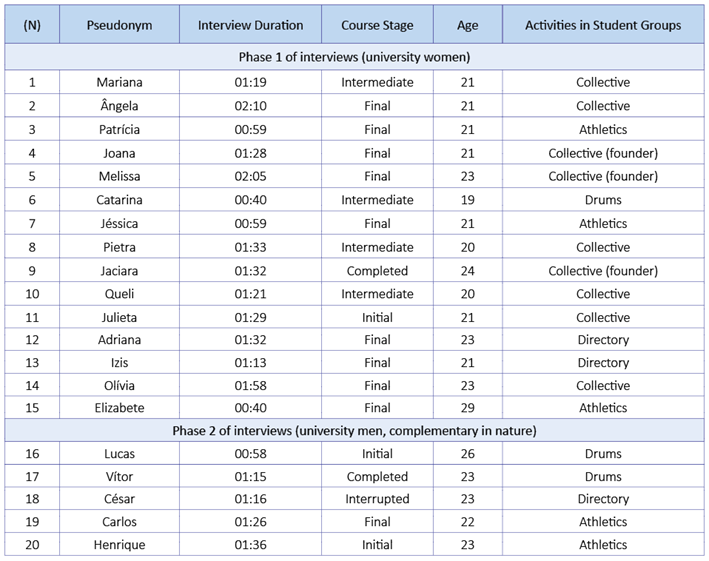 As entrevistas em profundidade (i) foram realizadas com 20 alunos de uma tradicional instituição de ensino superior brasileira, entre os anos de 2017 e 2018, com duração média de 81 minutos, totalizando 27 horas de entrevistas e 378 páginas de transcrições com espaçamento simples em fonte Times New Roman tamanho 12. Como principais critérios de seleção de respondentes cumulativos, ouvimos moças e rapazes que estudam ou estudaram nessa instituição e que fazem ou fizeram parte de grupos estudantis, como o coletivo feminista, o diretório acadêmico, a bateria e a atlética. Como nosso estudo é pautado em relatos sobre o exercício das masculinidades hegemônicas, ouvimos em especial nove moças que fazem parte da história do coletivo feminista, por ser este um grupo responsável pela coleta de denúncias de violência contra as mulheres no contexto da instituição de ensino da investigação, o que envolve, além do ambiente interno da instituição, festas, trotes e competições esportivas.